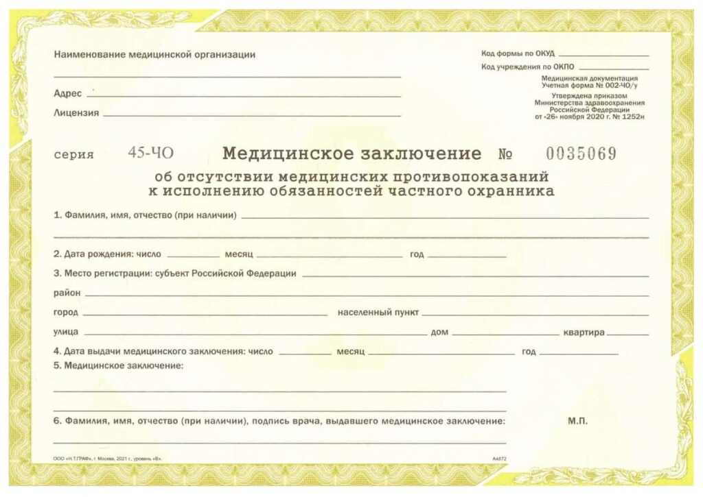 Чтобы получить справку 002-ЧО/у, кандидат на должность частного охранника должен попасть на прием к узким специалистам (наркологу, психиатру, окулисту), сдать в лаборатории анализы на наличие наркотических веществ. Окончательное заключение, в котором указывается отсутствие или наличие противопоказаний к работе охранником в частной охранной организации, делается терапевтом на основании результатов диагностики и осмотров врачами.